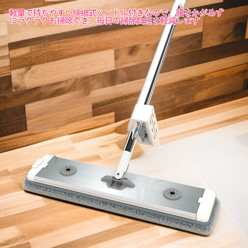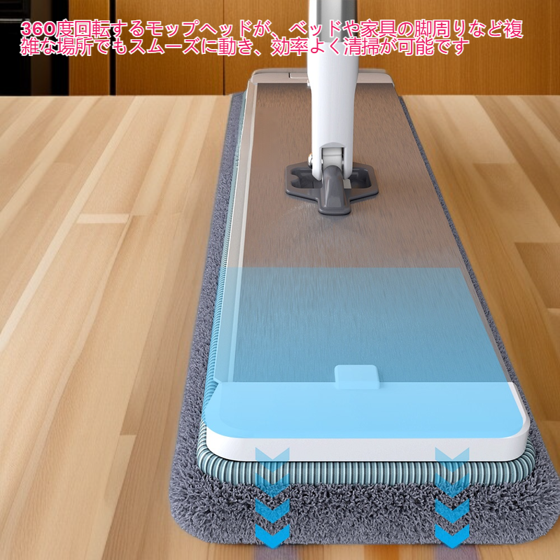 ● 360度回転するモップヘッドが、ベッドや家具の脚周りなど複雑な場所でもスムーズに動き、効率よく清掃が可能です。
